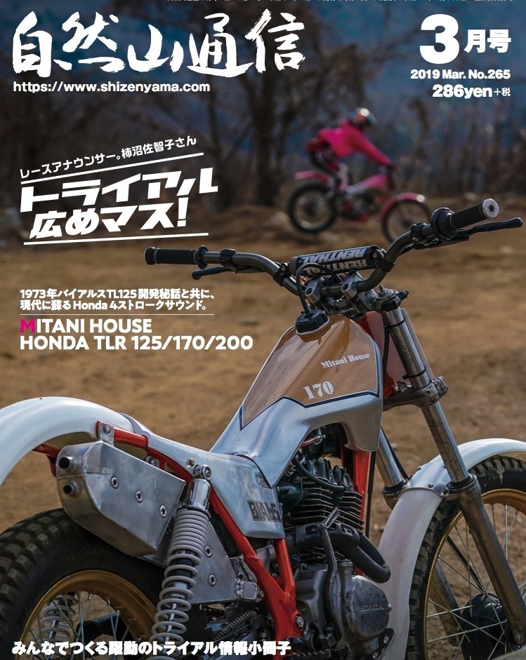 月刊自然山通信創刊22年のご挨拶/闘う藤波!挑戦し続けるフジガスが語るX-TRIAL/X-TRIAL R1ハンガリーBudapest・ボウ勝利、ラガが2位で2019シーズンが明ける・R2スペインBarcellona・トライアルメッカのバルセロナはラガが制す・R3スペインBilbao・久々の開催のビルバオ大会。ボウが2勝目を飾る/2019 GASGAS TXT RACING 2T 300/1973年バイアルスTL125 開発秘話と共に、 現代に蘇るHonda 4ストロークサウンド。MITANI HOUSE HONDA TLR 125/170/200・MITANI HOUSE Honda TLR125/170/200はこうやって仕上げました/レースアナウンサー柿沼佐智子さん。トライアル広めマス!/私の日本から世界へ。いま思い返す87年のヨーロッパ・連載第28回文・イラスト/黒山一郎/出逢いのチカラ・寺田智恵子さんと、トライアル/シェルコが20周年/全国全世界・選手権草大会ツートラスケジュール早見表/イベント情報掲示板/気になる情報掲示板・トライアル新製品情報&トライアルショップ最新情報!/トライアルイベント予定表/トライアルの軌跡(イベントリザルト)/◎B5サイズ・オールカラー・58ページ